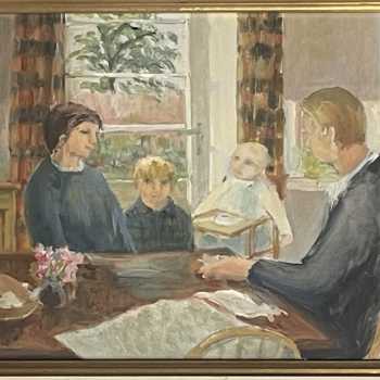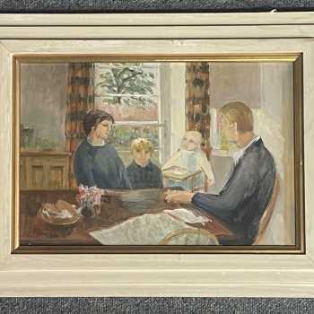 Helmut Petzsch A Family Gathering Oil on Board Frame: 12” x 16” Image: 8” x 12” Provenance: Collection of the family. Helmut Petzsch (1920 - 2008) was a painter in oil and watercolour, of landscapes, urban scenes and figure subjects. He came from Germany to England in 1932, and later studied at the Edinburgh College of Art under William Gillies. He exhibited at the Royal Scottish Academy and with the Society of Scottish Artists.