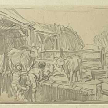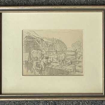 George Soper Children at the Farm Pencil on Paper Frame: 6.75” x 8.5” Image: 3.25” x 4.5” Provenance: Bonhams’s Soper Studio Sale 1992 George Soper was born in May 1870. He was a regular exhibitor at the Royal Academy (48 works) and elected a full member of the Royal Society of Painter-Etchers and Engravers in 1920, with whom he exhibited 80 works. He exhibited widely at many of the principle London and provincial galleries of his day.He died at Harmer Green, Welwyn on 13 August 1942. Both the British Museum and the Victoria and Albert Museum, London, hold examples of his work in their collections.